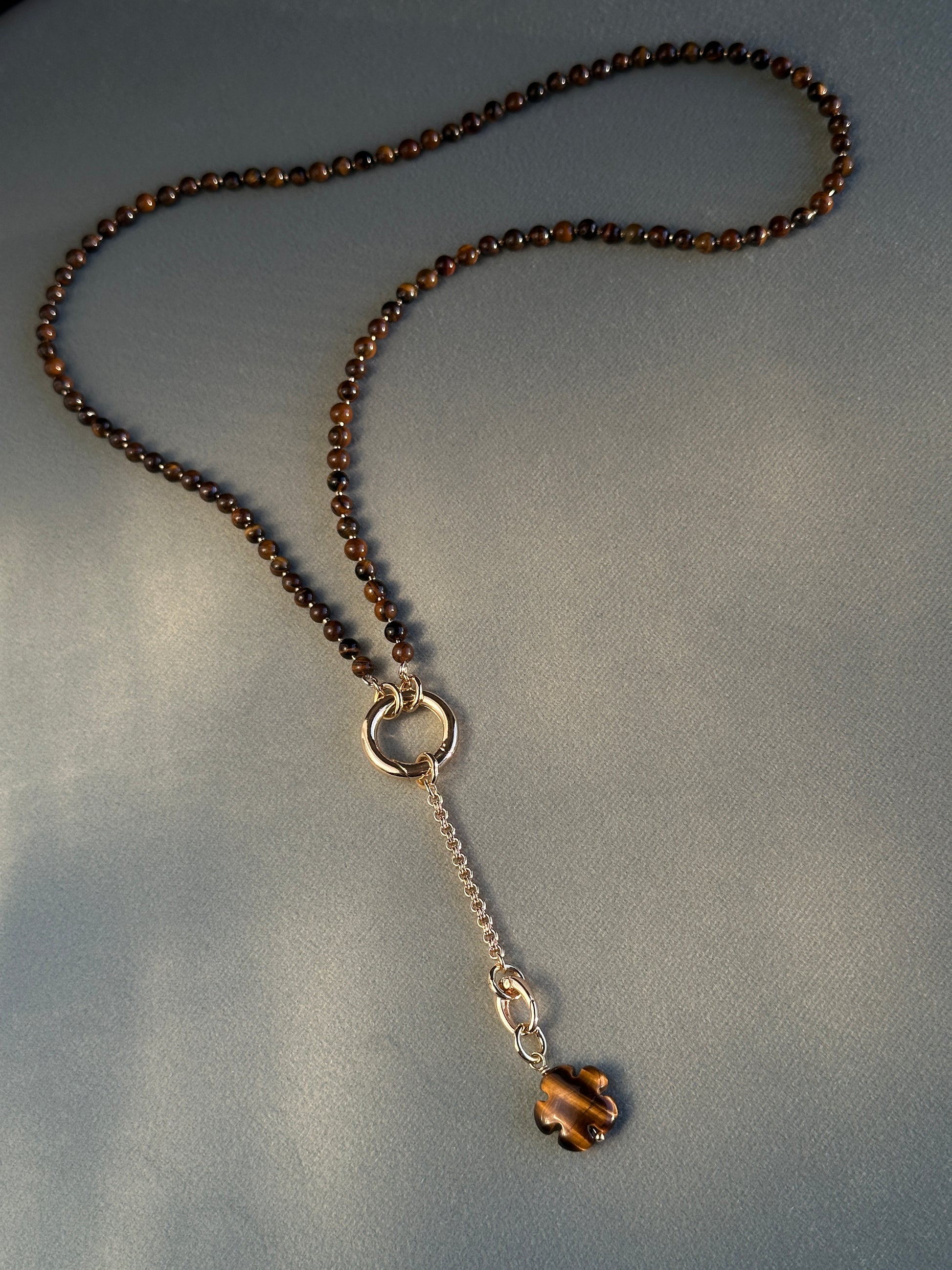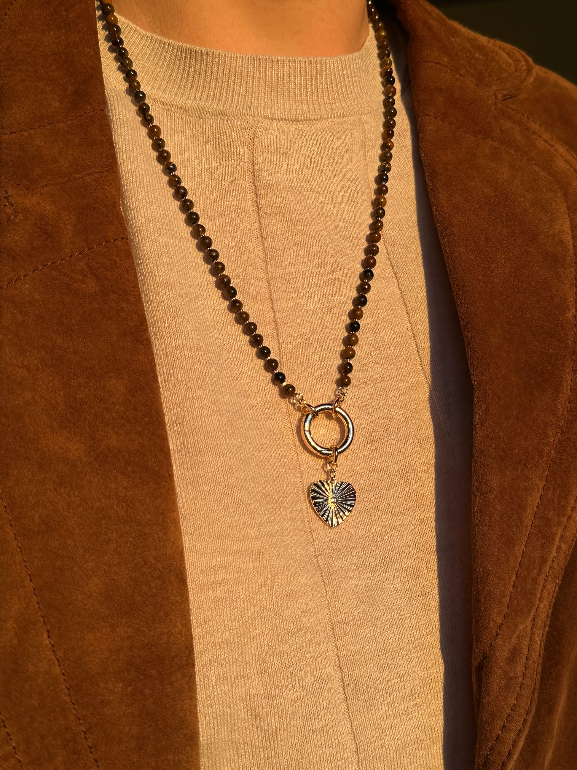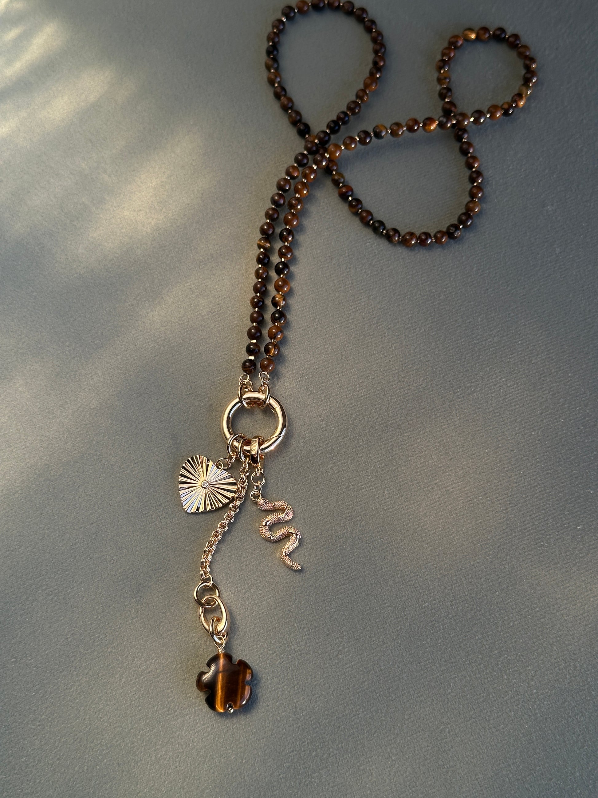 TORA necklace features a strand of natural tiger eye stone beads with the link clasp and 3 detachable pendants: cubic zirconia inlaid heart pendant, carved tiger eye stone flower pendant and snake pendant on enhancer bail. An enhancer is a type of bail that hinges open in the back. This means you can open it up and clip your pendant right onto the middle of your beaded necklace or you can transform your necklace into a Y-shaped one by following these simple steps: