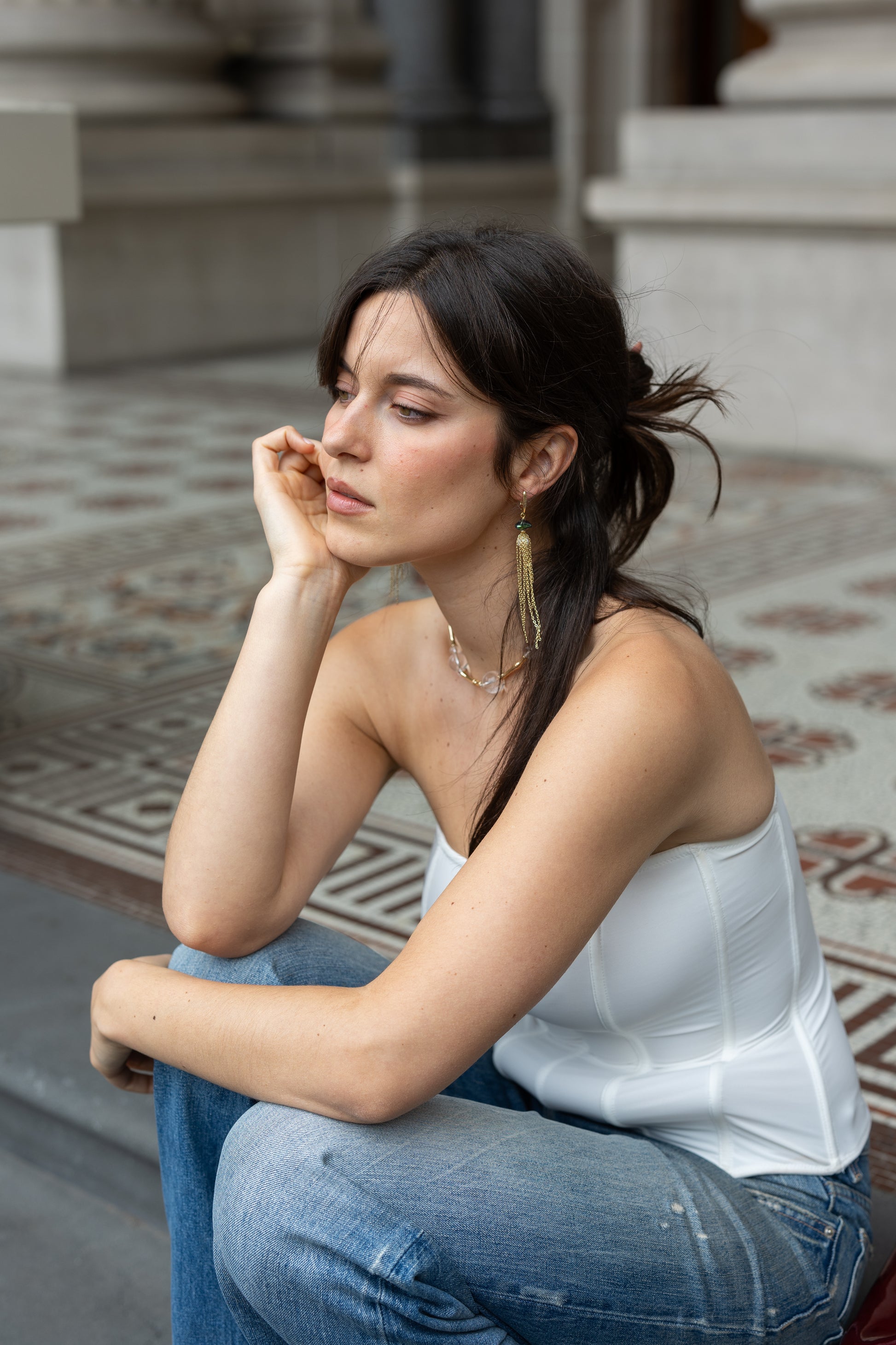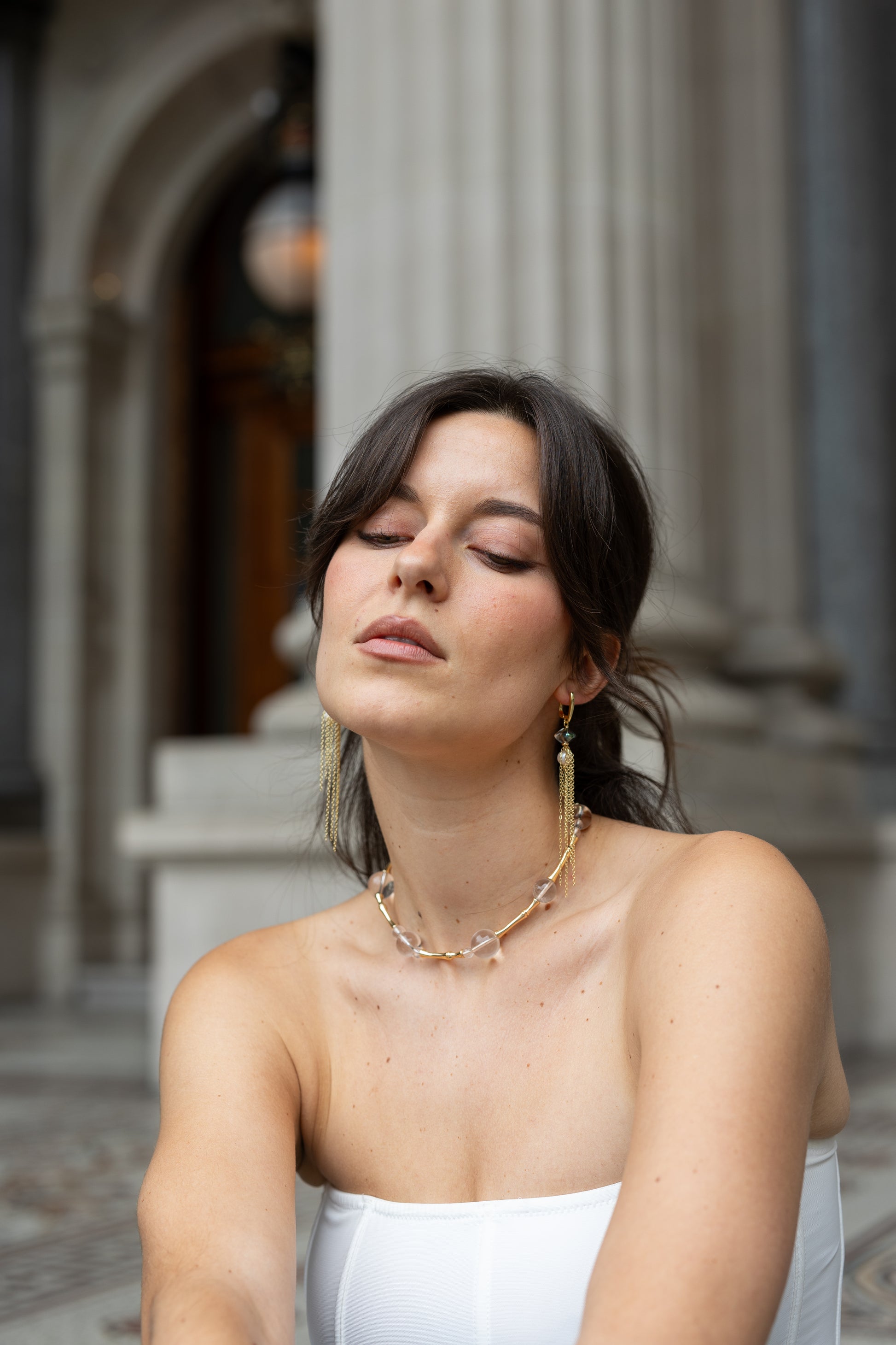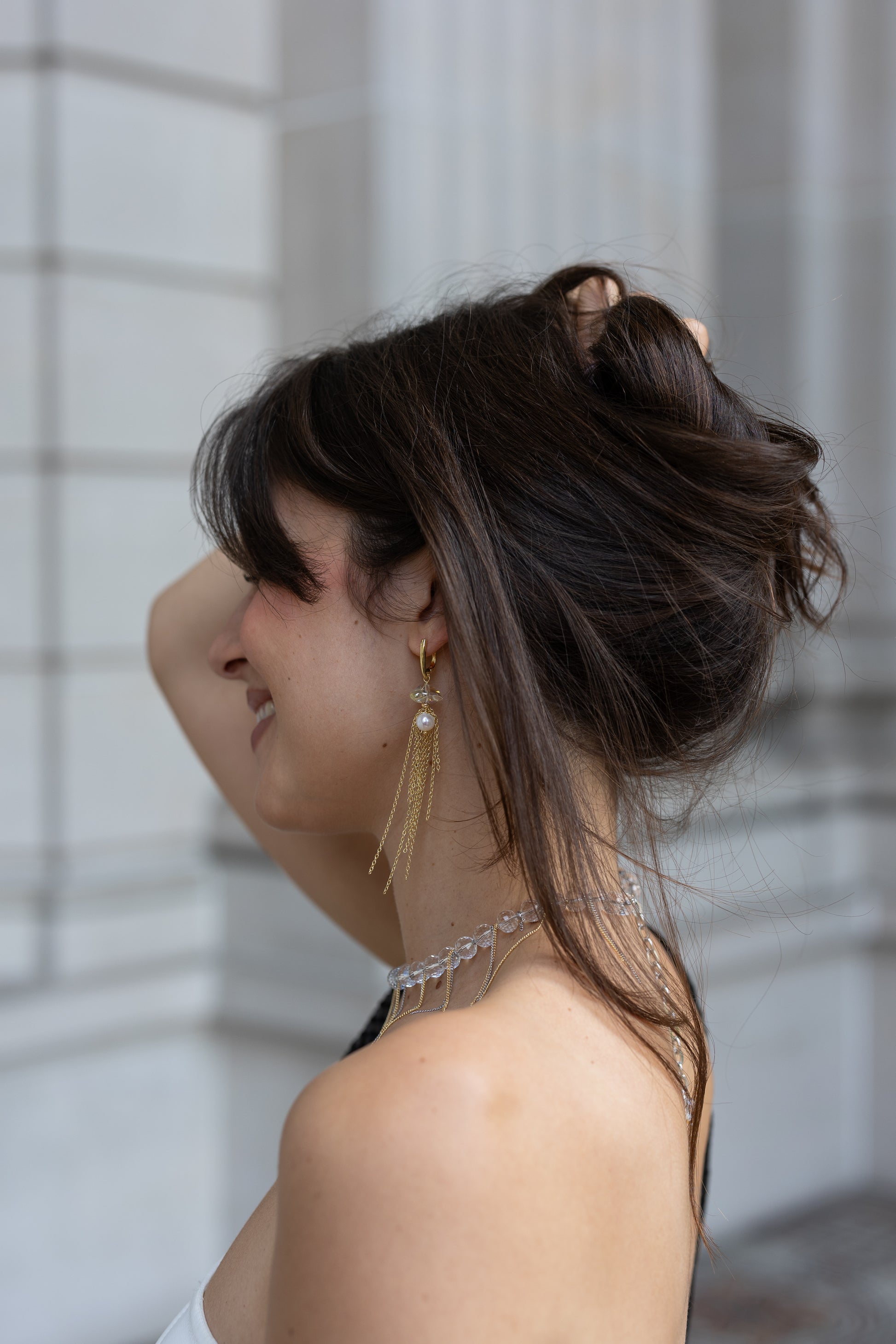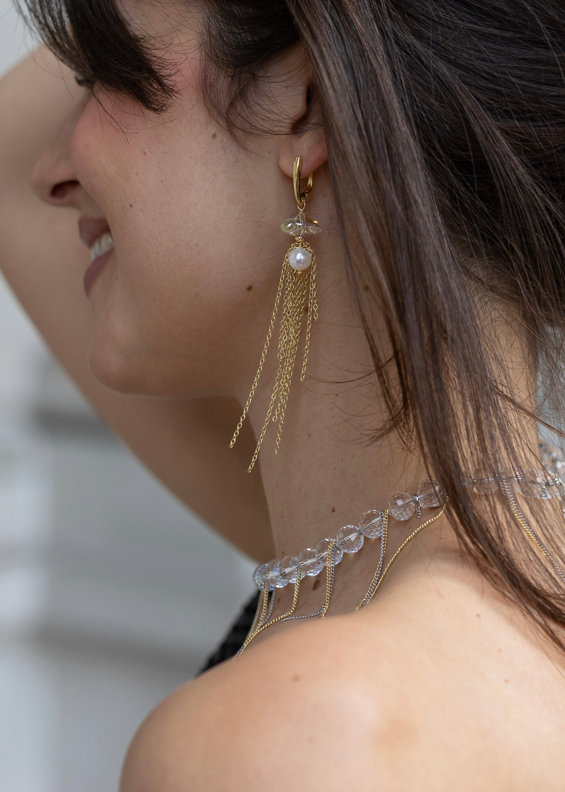 JELLY FISH chandelier earrings are an ultimate accessory for a modern mermaid. JELLY FISH earrings feature natural freshwater pearls paired with pebble shaped glass beads and finished with dainty chain tassels. Earrings come on a latch back earring closure.