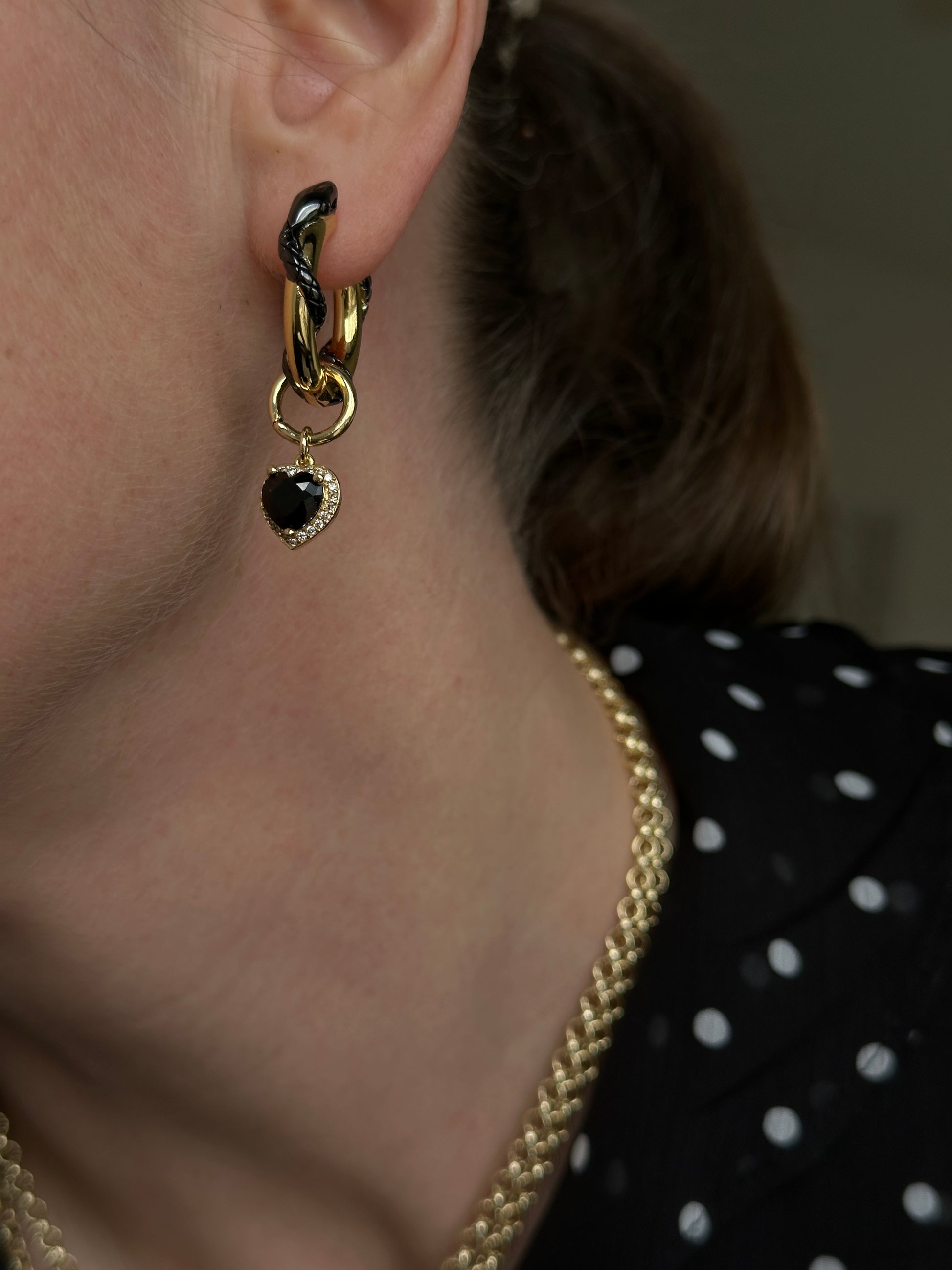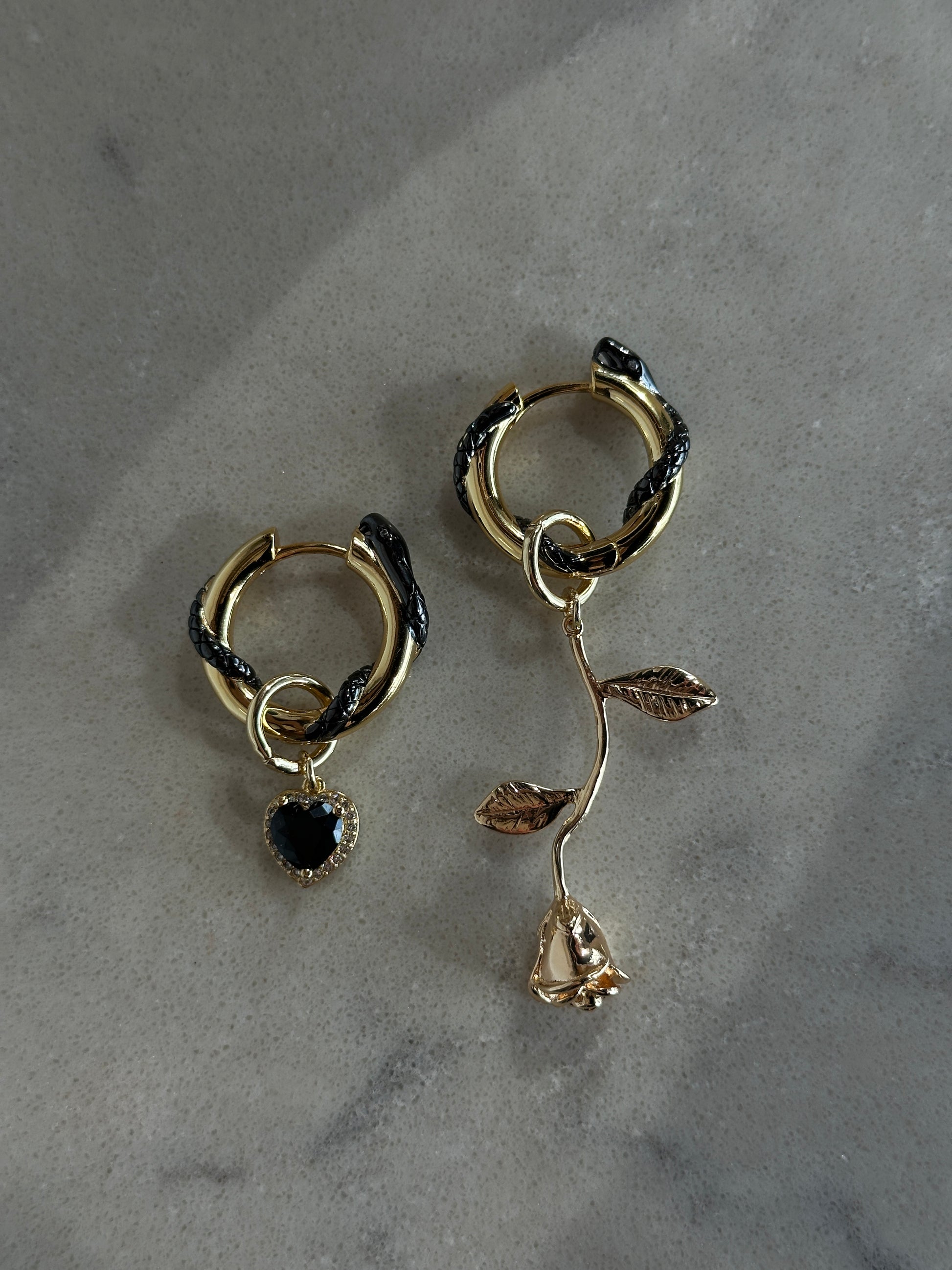 ROSE MAMBA convertible earrings feature two-tone hoops with asymmetrical detachable pendants - cubic zirconia inlaid heart and rose pendant. These earrings are an eye-catching conversation starter. Rose encompasses beauty, grace and commitment, while a snake represents transformation, rebirth and wisdom.