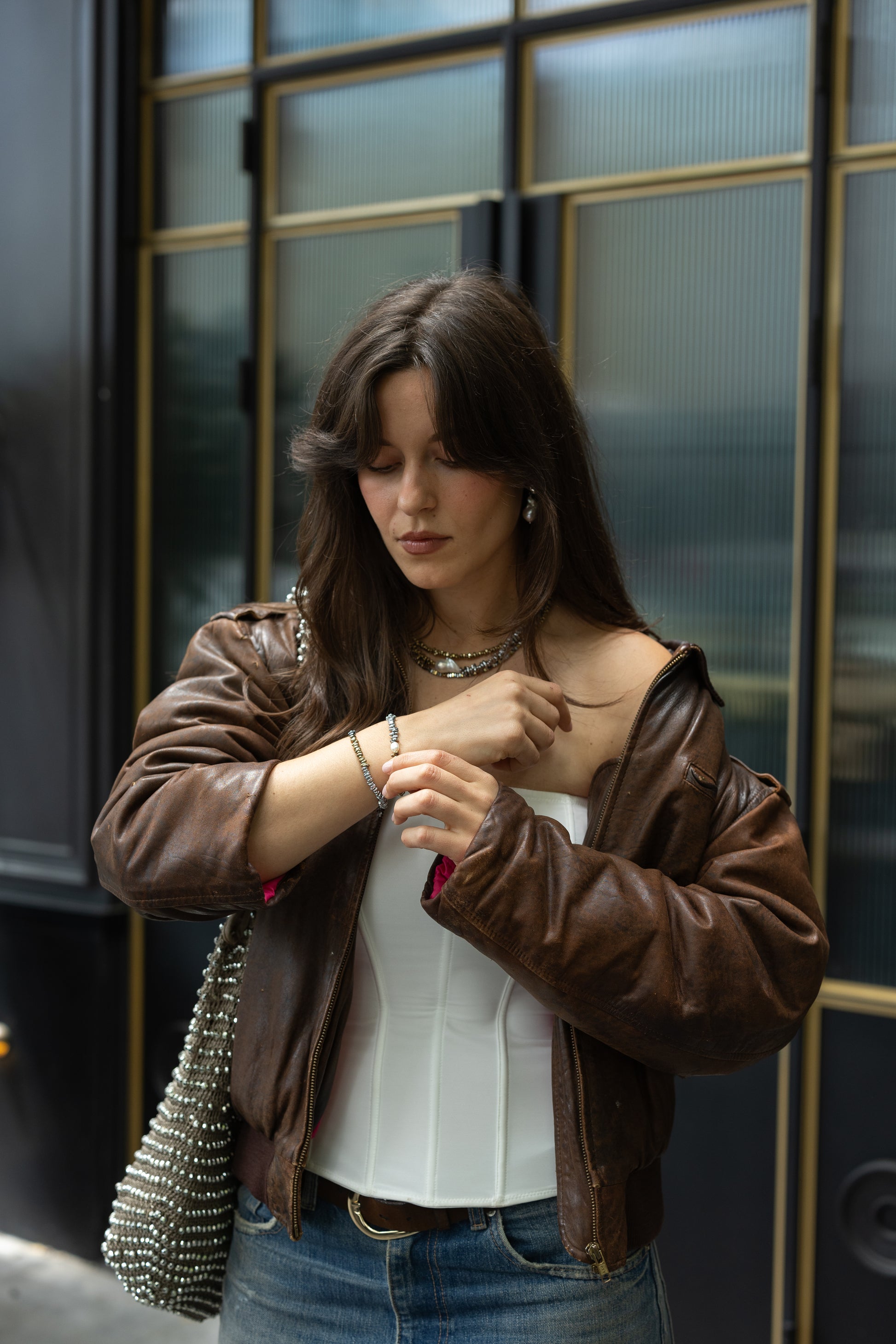 DUAL bracelet features natural pebble shaped hematite beads and natural freshwater pearl as centre piece. DUAL bracelet can be styled solo or stacked with other bracelets.