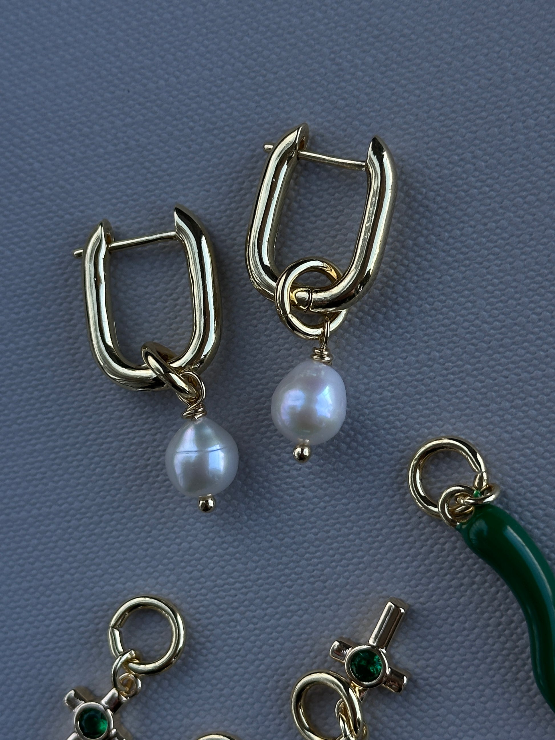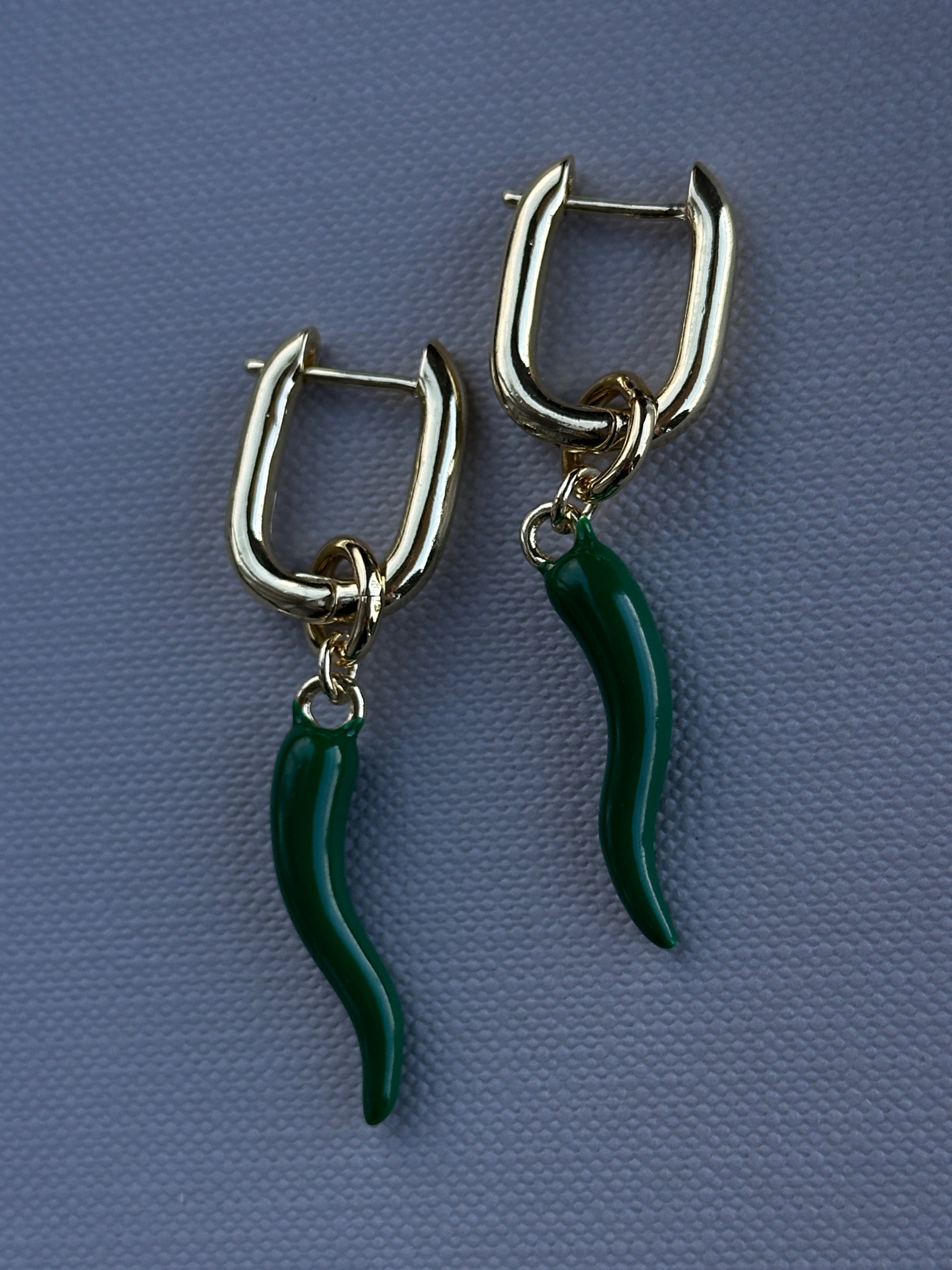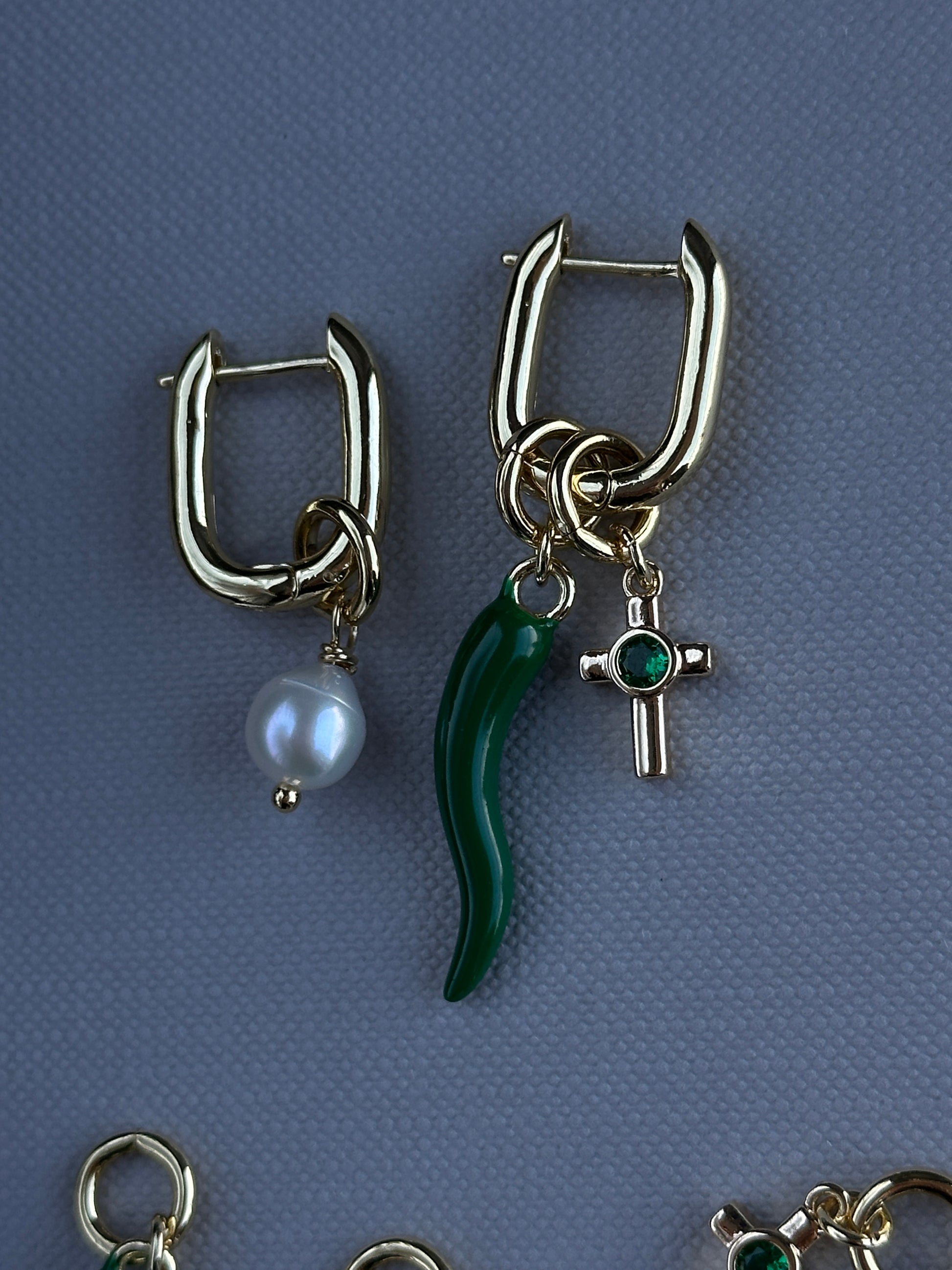 CHILI GREEN convertible earrings feature 3 pairs of detachable interchangeable pendants: natural freshwater pearl pendants, enamel chili pendants and cubic zirconia inlaid cross pendants.