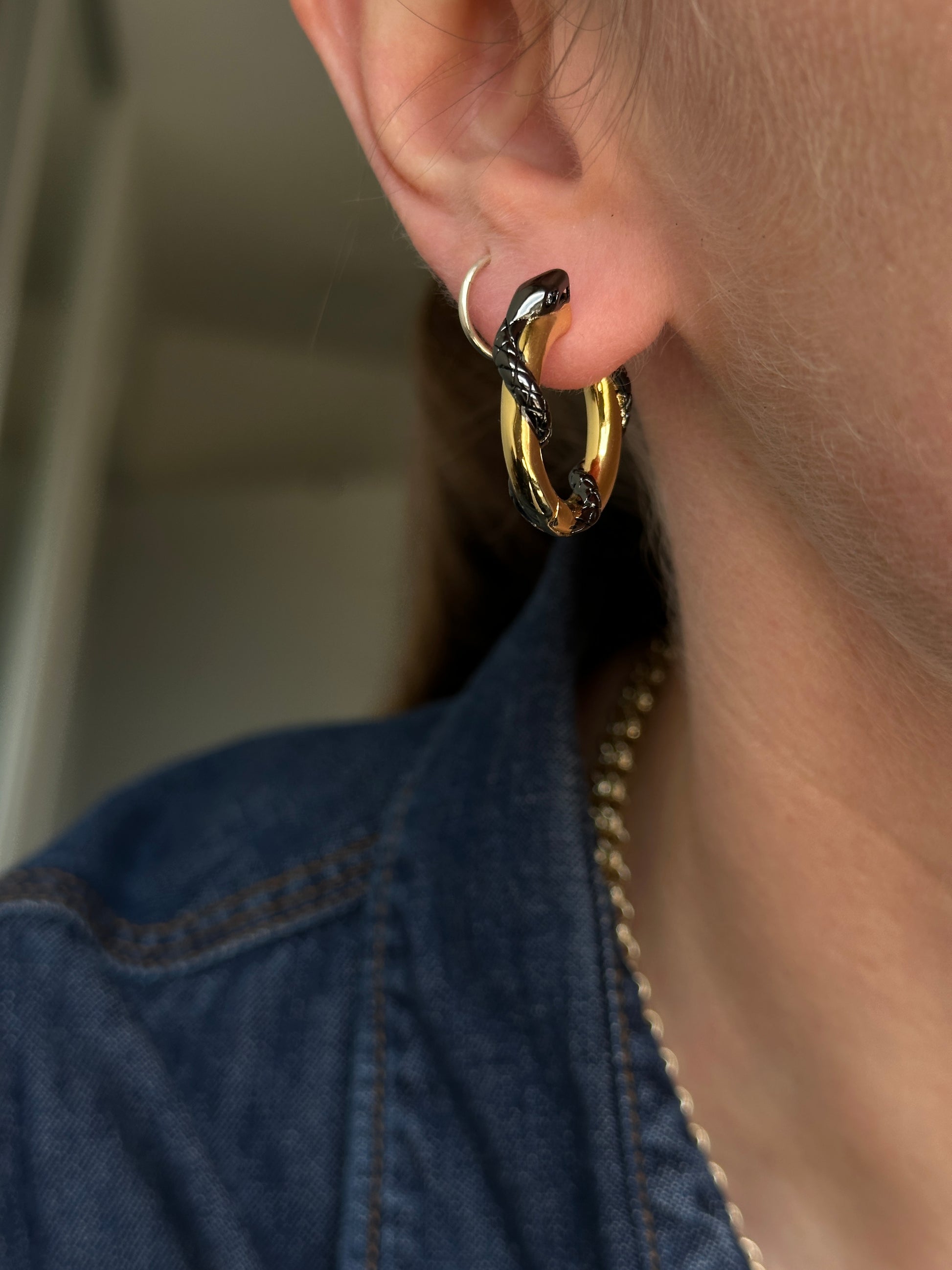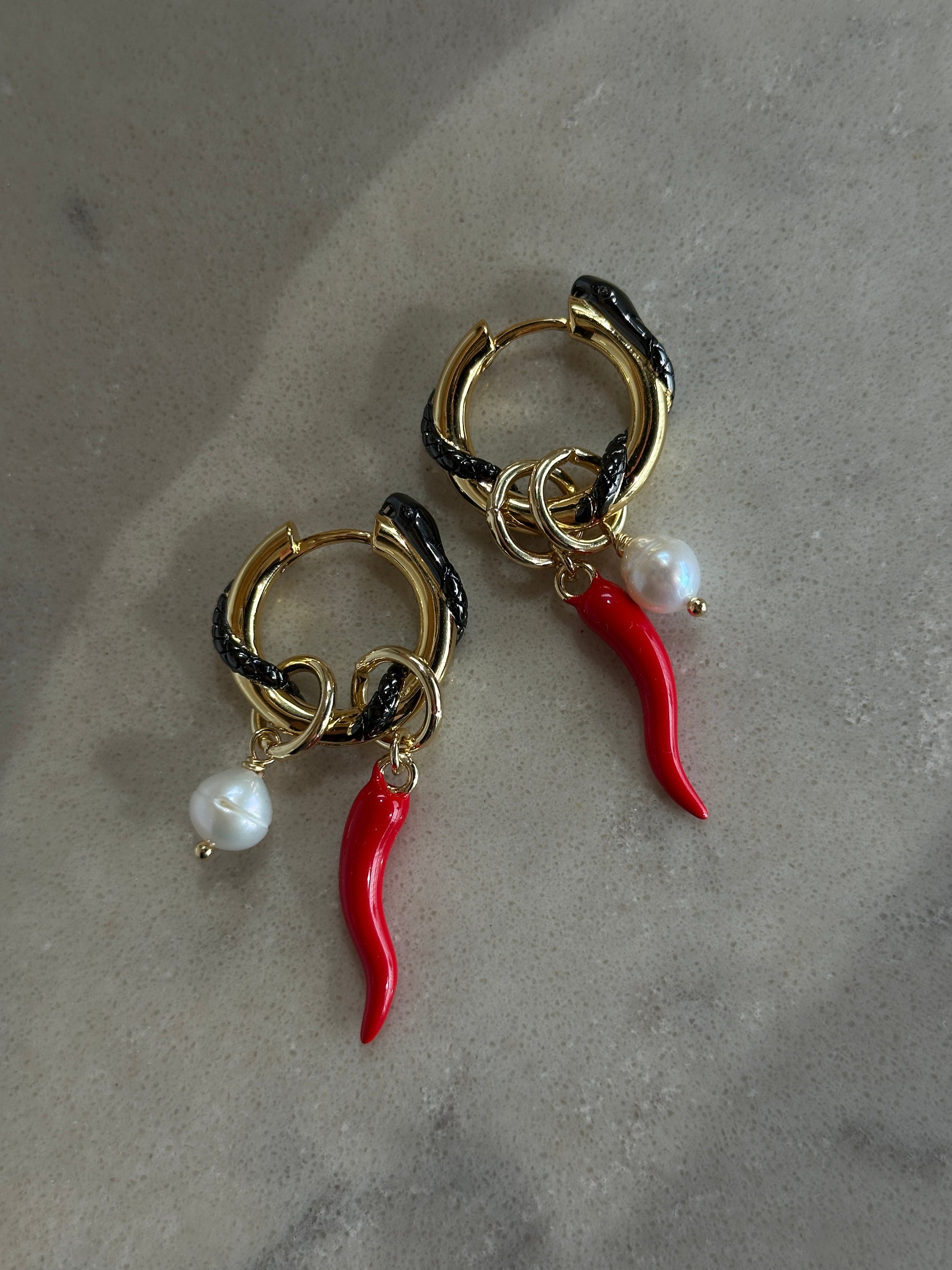SPICY MAMBA convertible earrings feature two-tone hoops with detachable pendants: red enamel coated chilies and natural baroque pearls. These earrings are an eye-catching conversation starter. Chili pepper or Italian cornicello symbolises good luck, protection against the "evil eye" and is linked to strength, fertility and vitality, while a snake represents transformation, rebirth and wisdom.