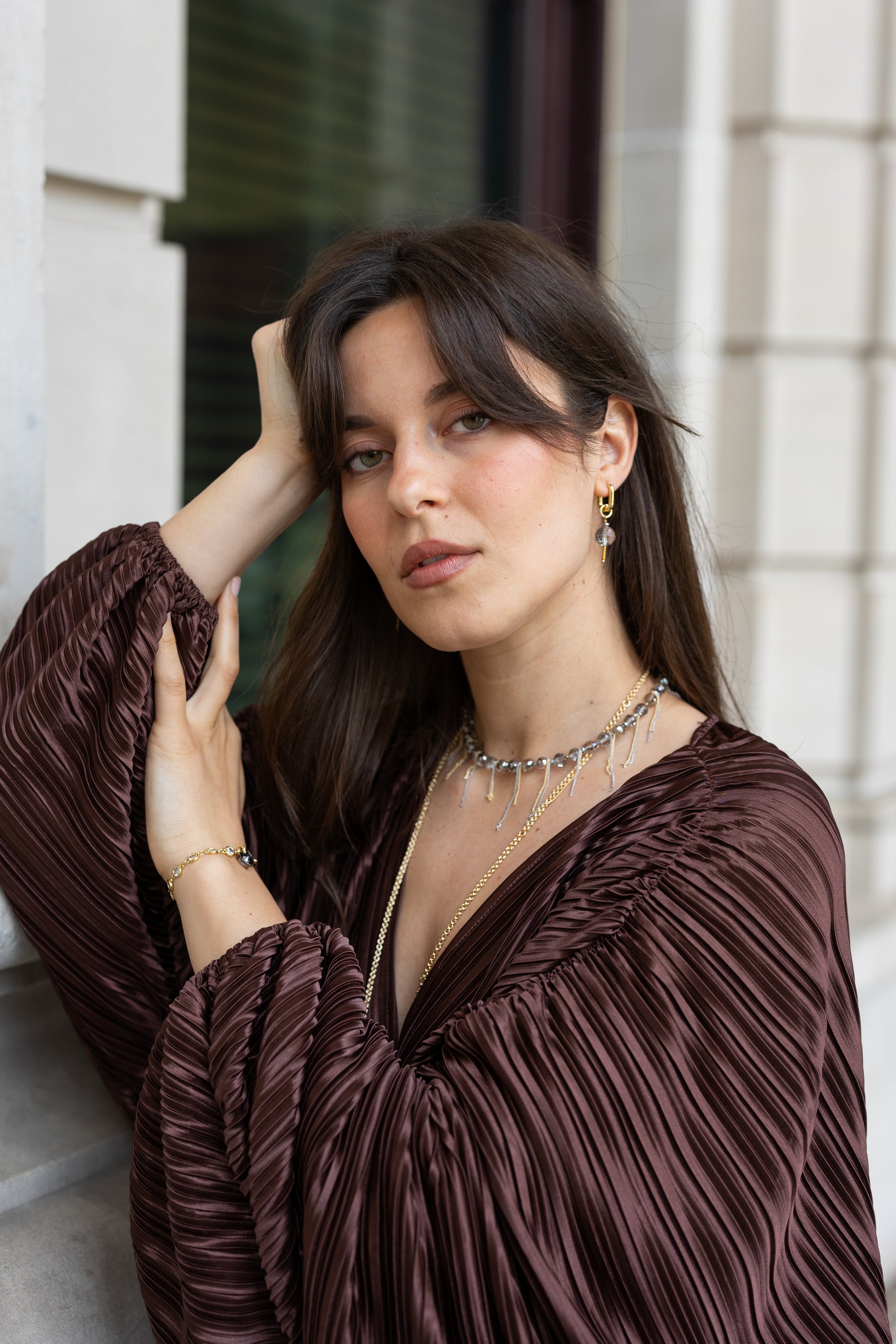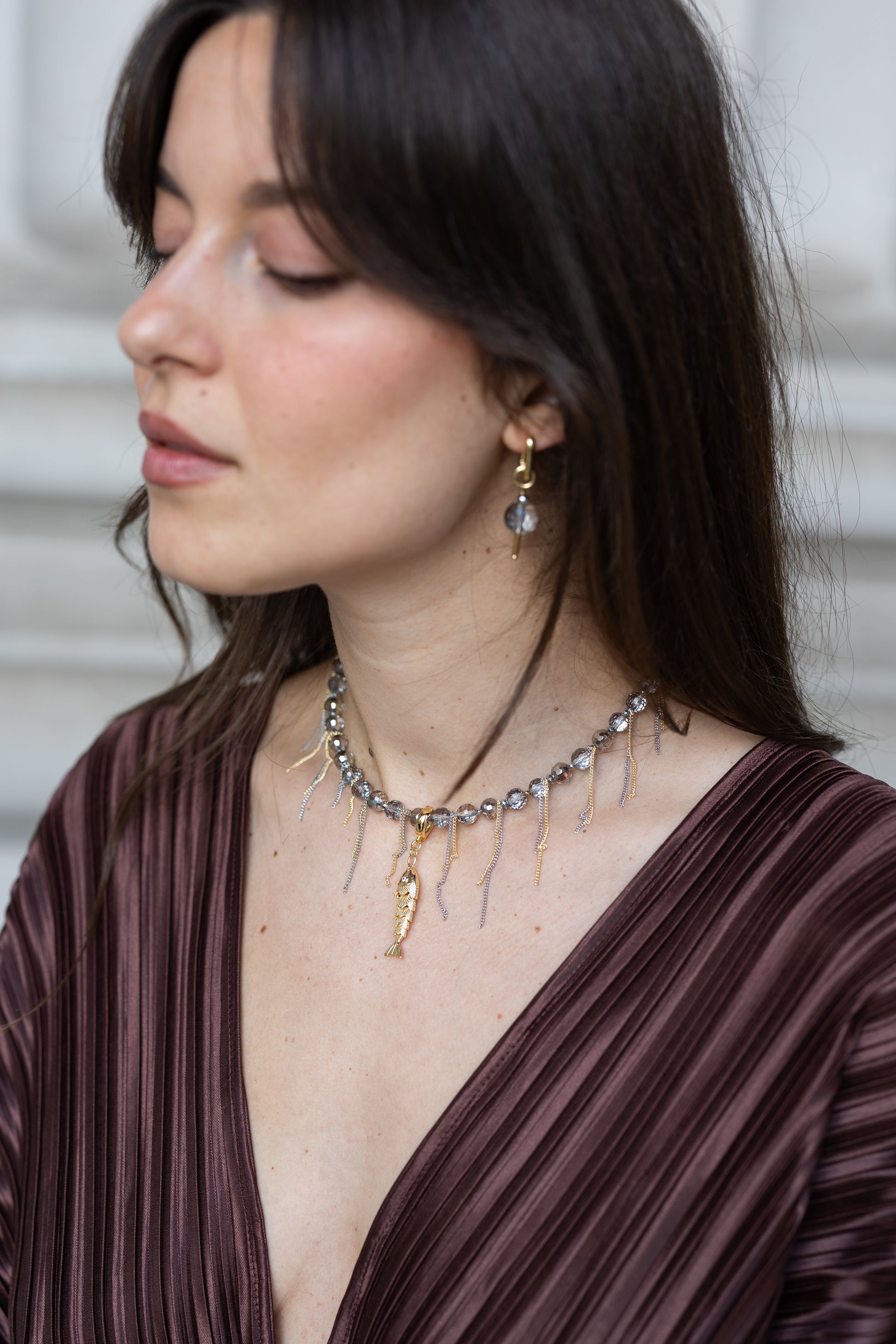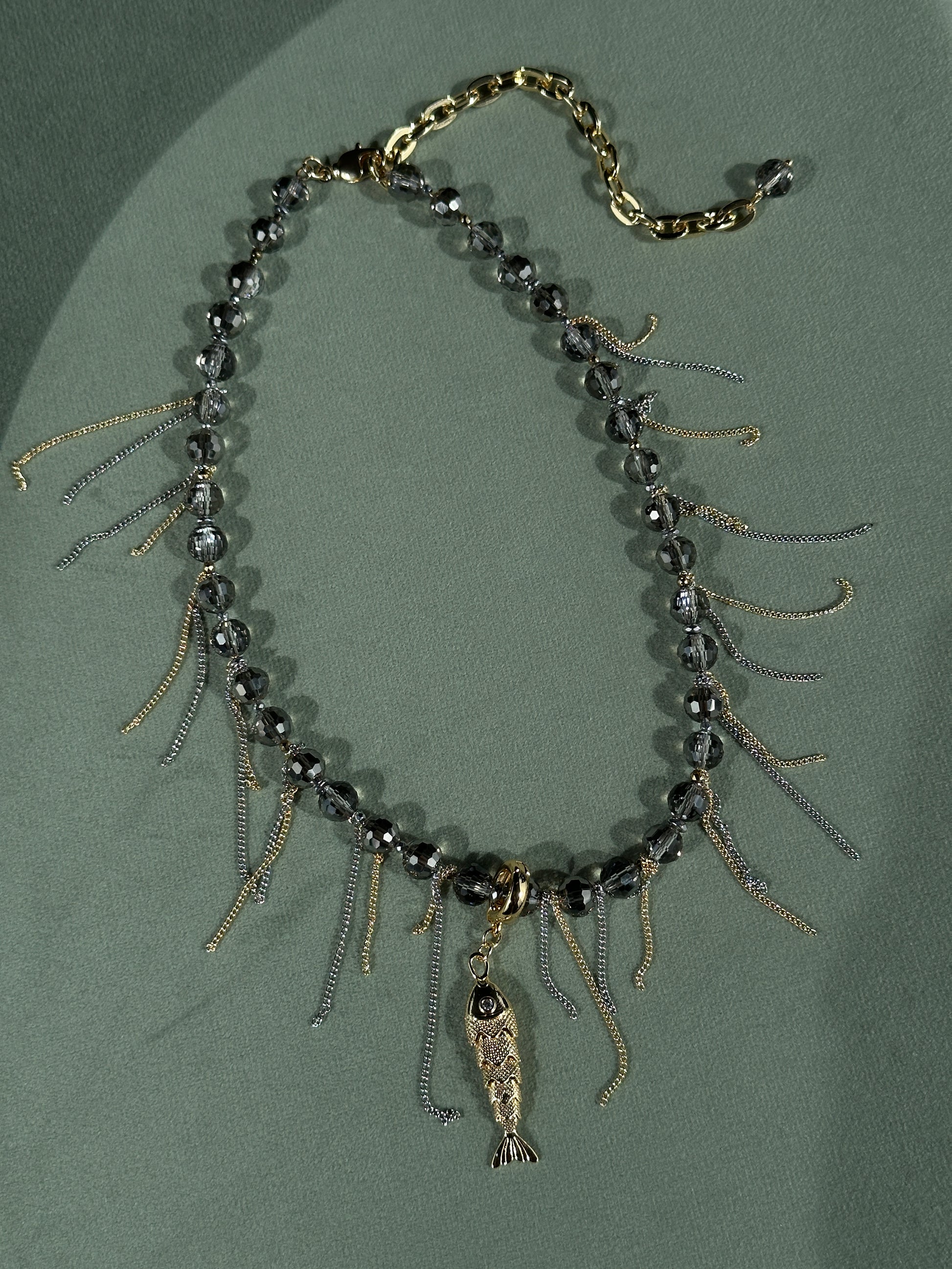 WAVY TAIL necklace is a limited edition statement piece designed to sparkle from every angle. It features a striking mix of sparkly faceted crystal beads paired with multicoloured hematite beads, finished with a delicate two tone chain fringe that adds fluid movement and shine. The lobster clasp closure is complemented by a long drop extension chain that beautifully accentuates your back line.