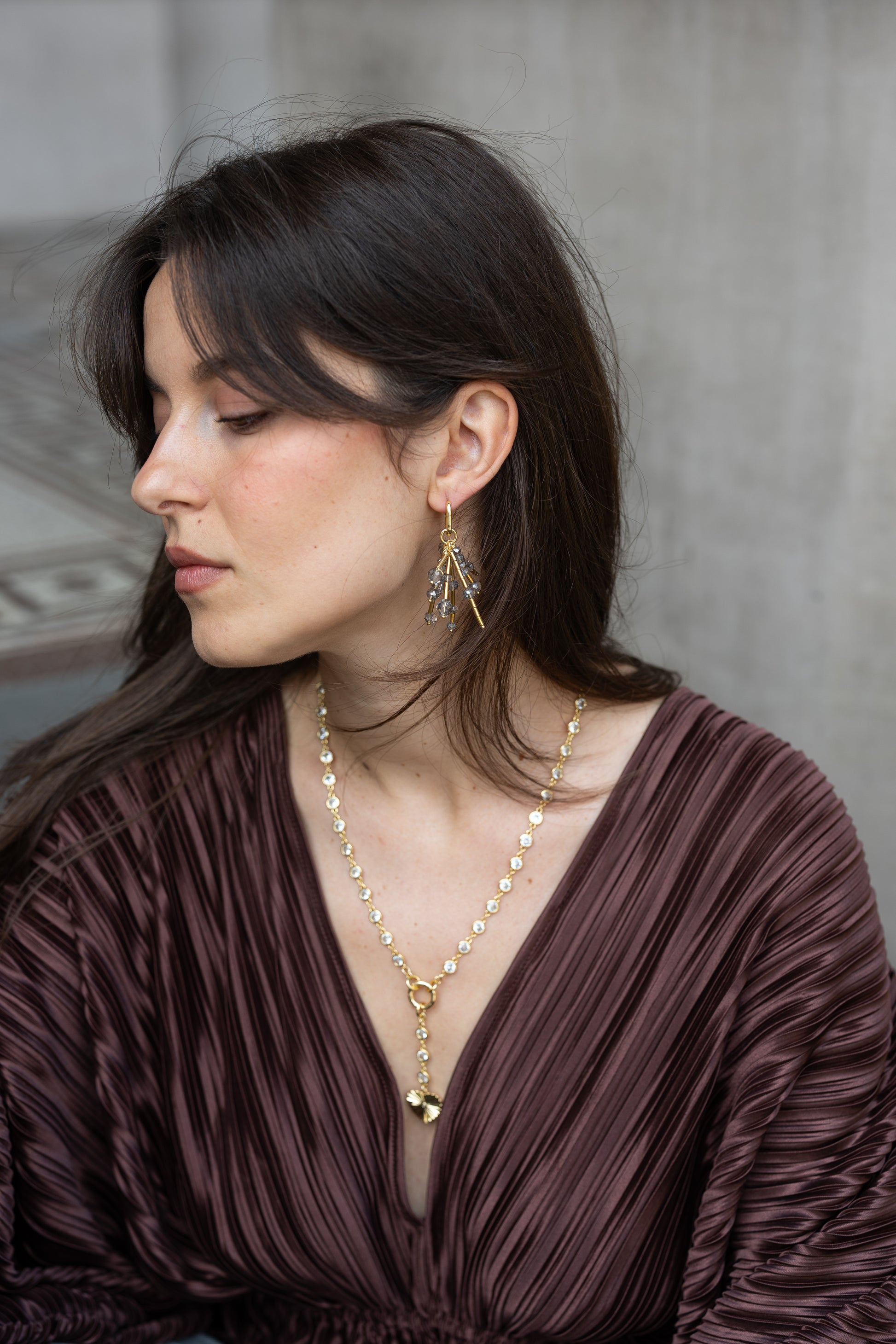 Light catching, festive, and impossible to miss. FIREWORK earrings feature shimmering cluster pendants crafted from sparkly faceted crystals and sleek hematite tube beads on rectangular hoops. The clusters shimmer and flare with movement, echoing the burst of fireworks in the night sky.