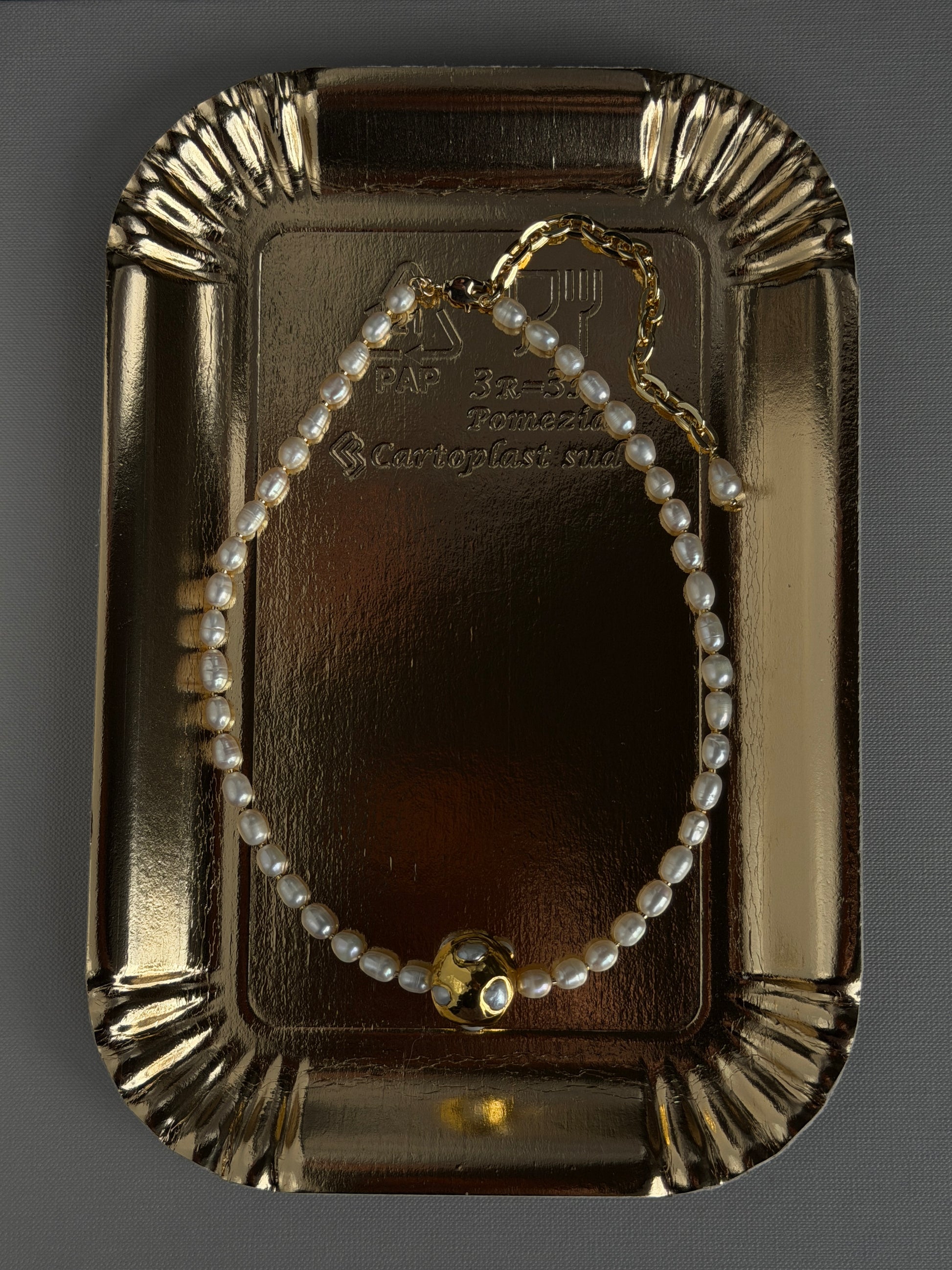 KAI necklace features natural freshwater pearls adorned with chunky gold plated pearl inlaid bead as centre piece. KAI necklace can be styled solo or layered with other necklaces and chains.