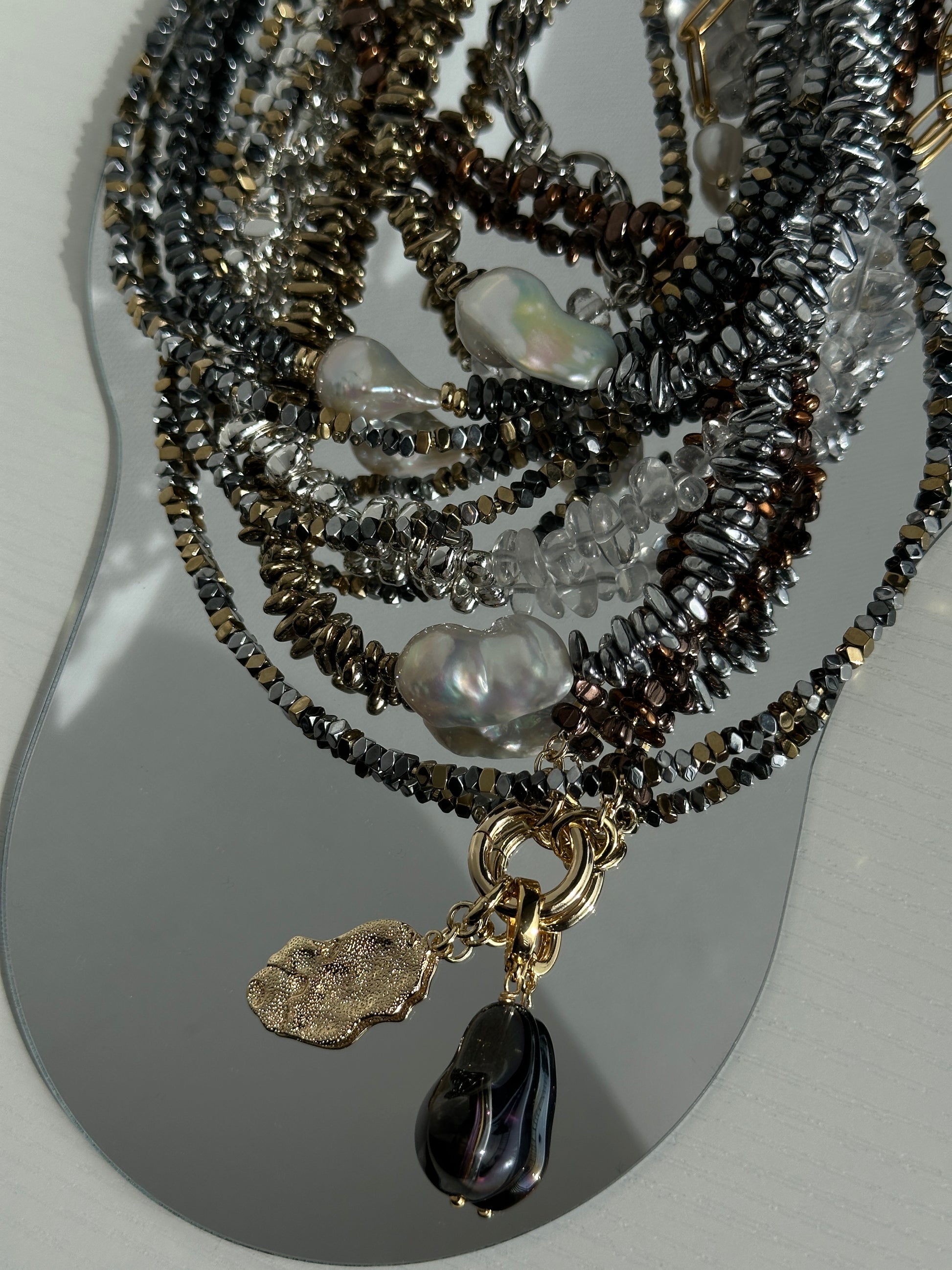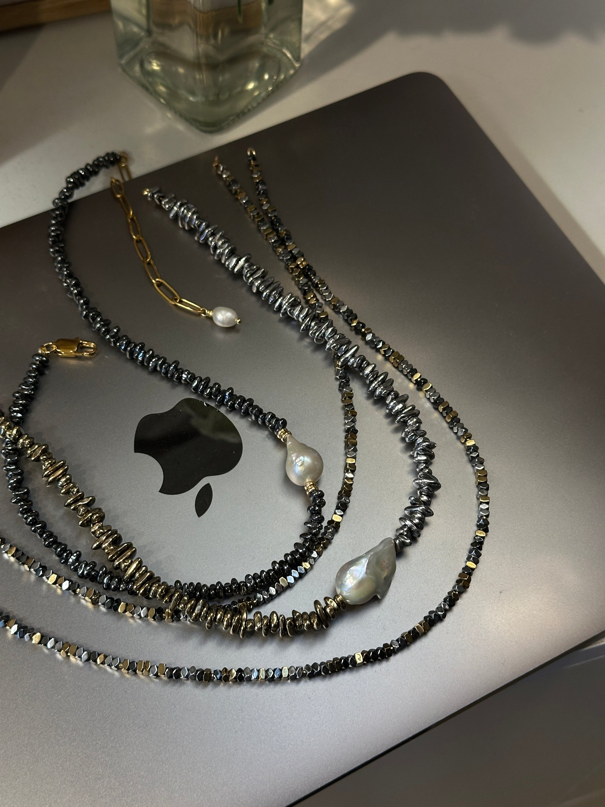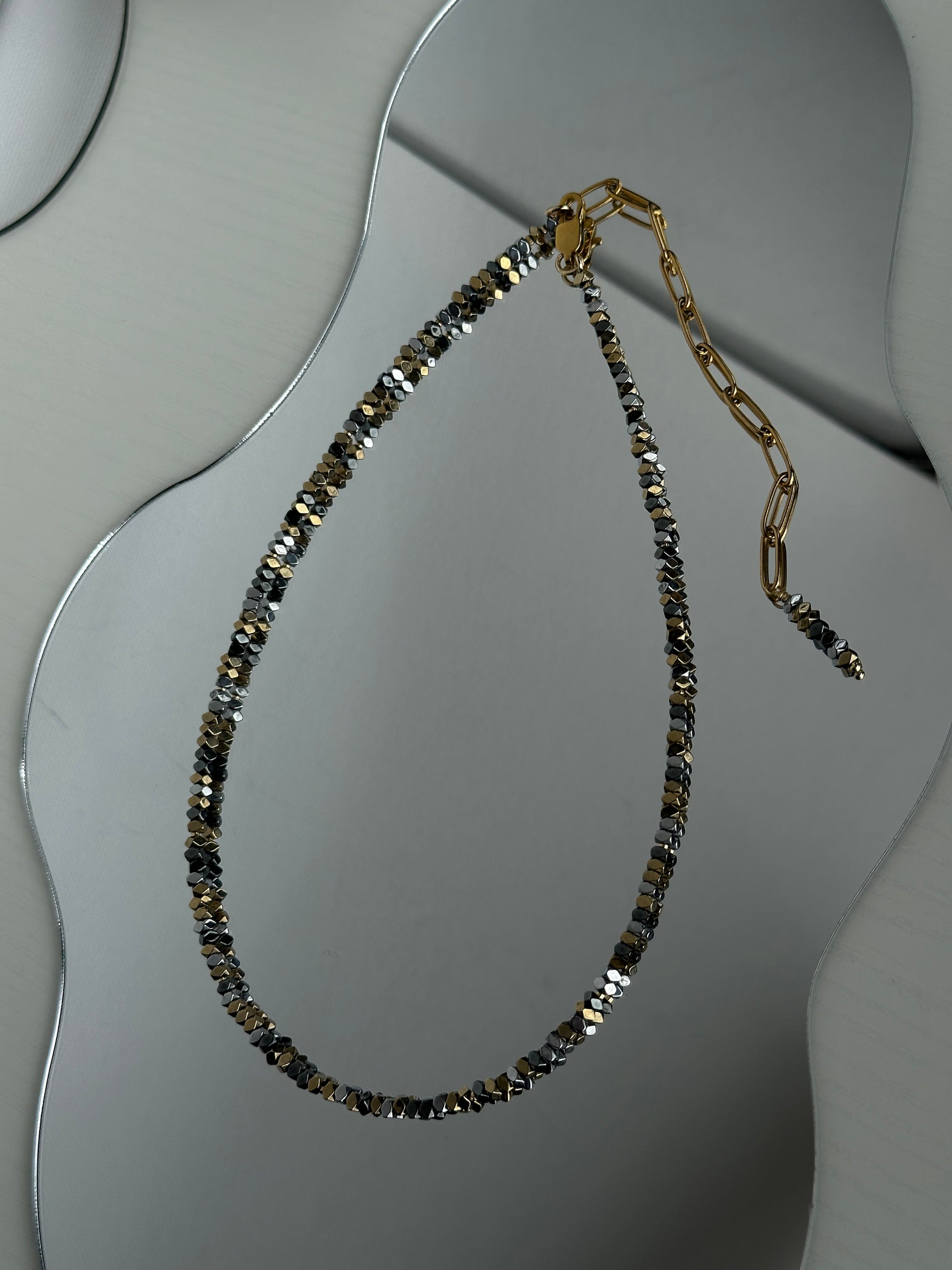 LIRA necklace is so stylish it's likely to become a favourite piece in your jewellery collection. LIRA necklace is made of natural faceted hematite beads plated in different tones of metal. Necklace can be styled solo or effortlessly layered with other necklaces and chains matching jewels both in gold and silver colour.