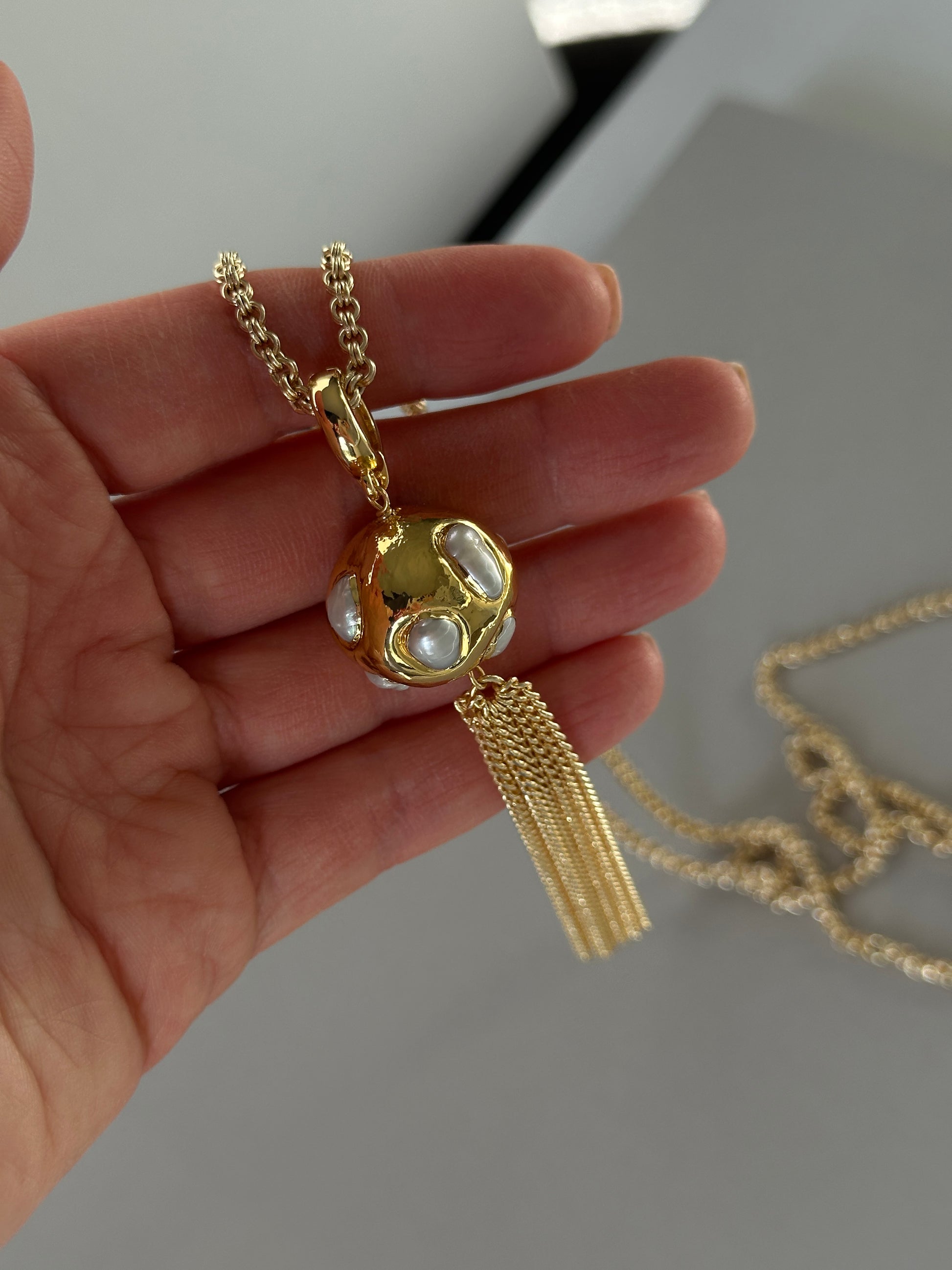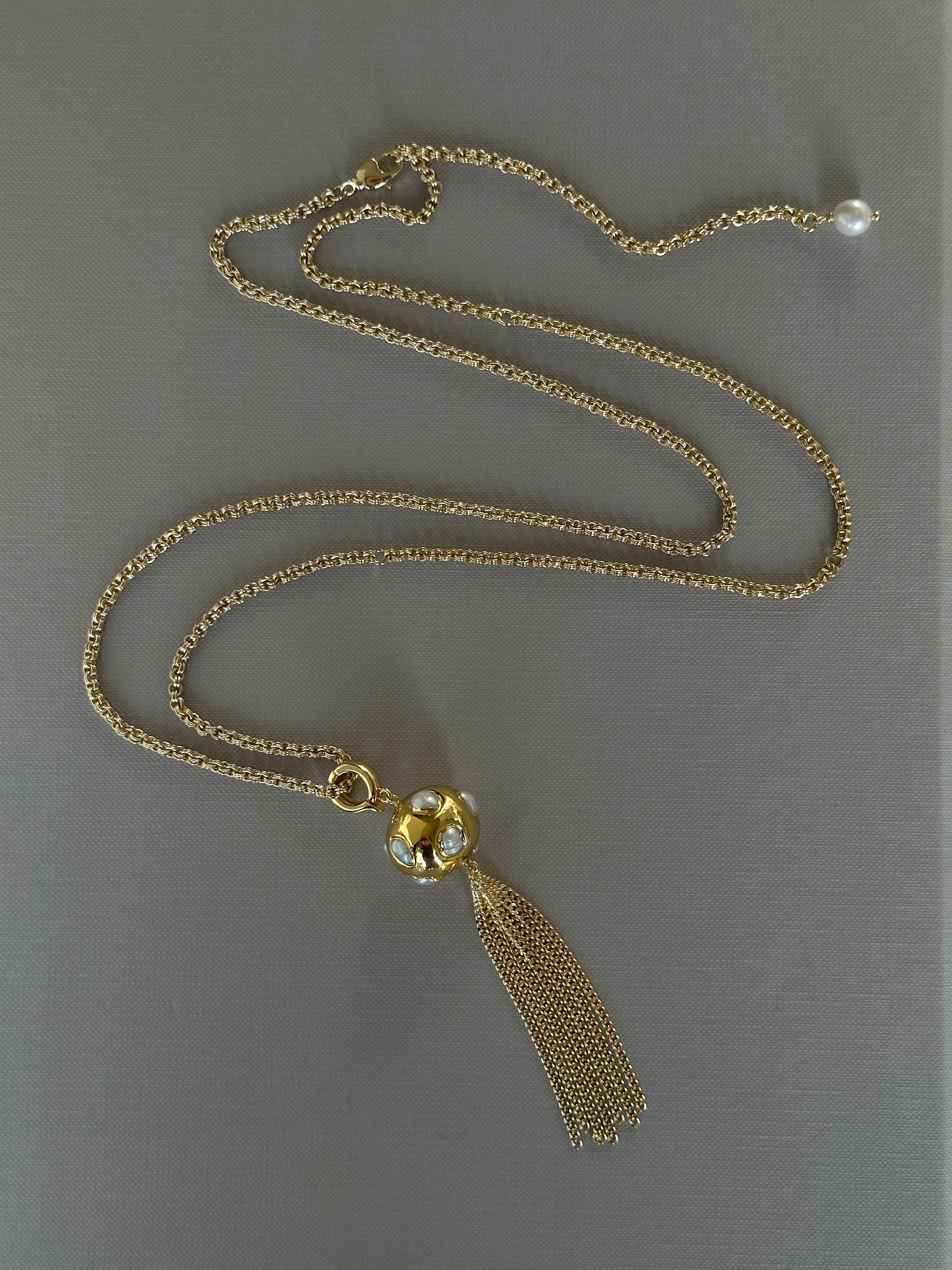 KAIA long drop necklace features long adjustable gold plated chain and gold plated chunky ball pendant inlaid with freshwater pearls and finished with dainty chain tassel. Tassel pendant comes on enhancer bail.