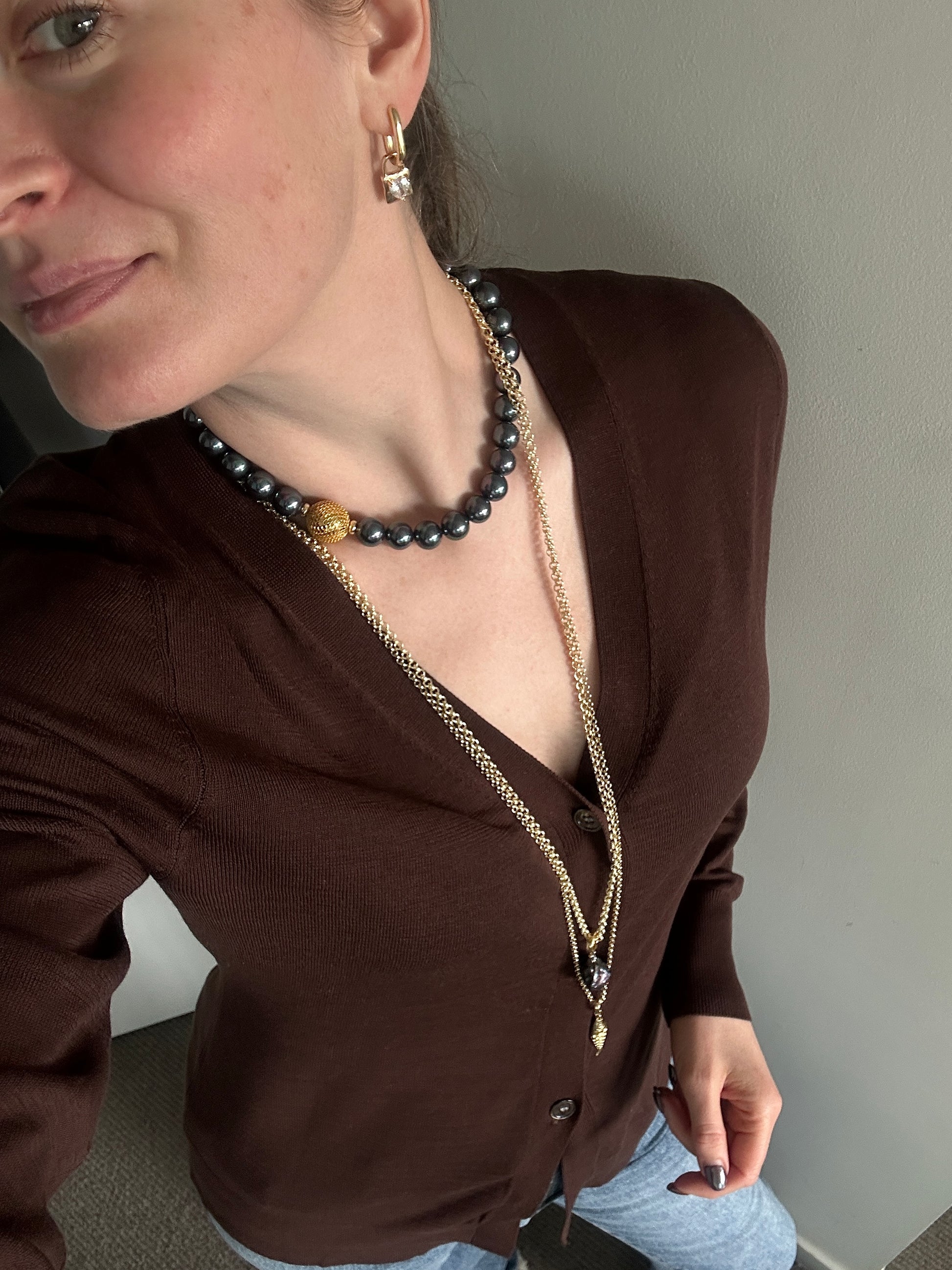 This necklace can be styled solo as a statement piece or layered with other necklaces or chains for a sophisticated "neck mess" look.