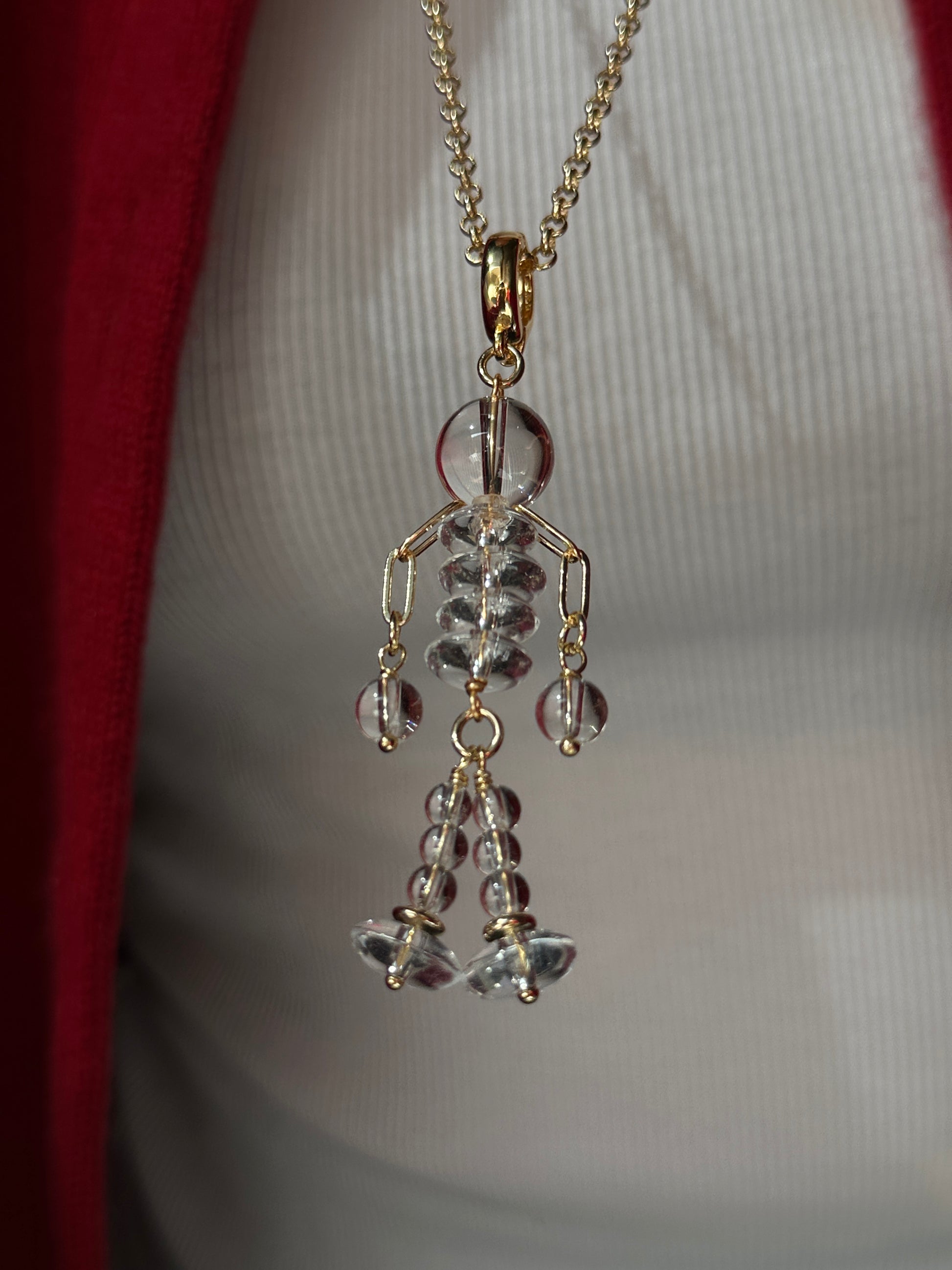 CRYSTAL MAN long drop necklace is the ultimate accessory for the modern muse! An ironic and playful pendant made of clear glass comes on enhancer bail which hinges open in the back. This means you can open it up and clip your pendant right onto the middle of your chain or beaded necklace. And spice it up!