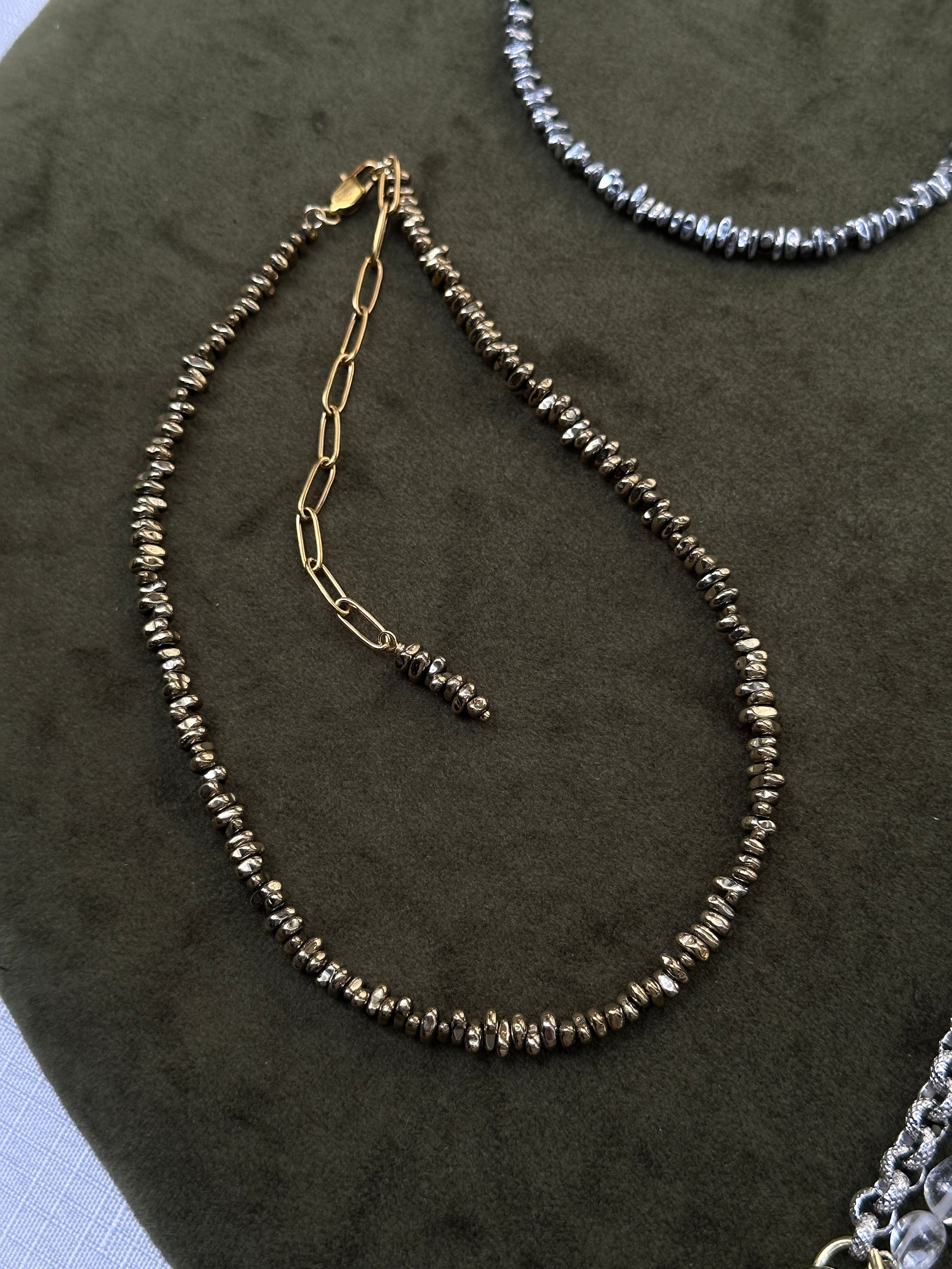 CURRENT necklace is effortlessly stylish. It's likely to become a favourite piece in your jewellery collection. CURRENT necklace features natural pebble shaped hematite beads and can be styled solo or layered with other necklaces and chains.