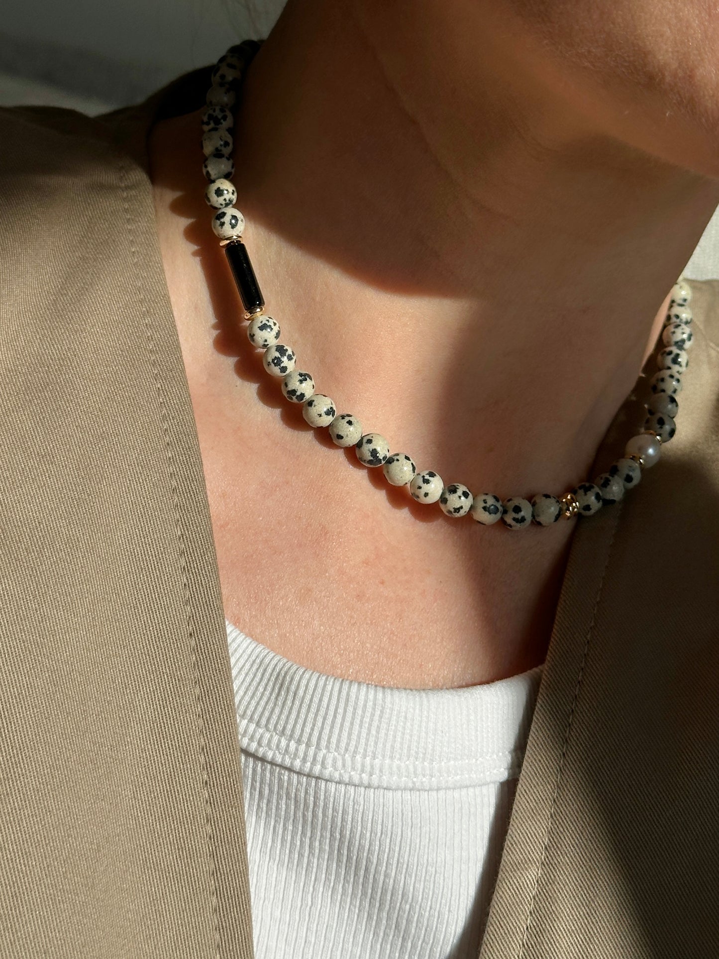DALMATIAN necklace features natural dalmatian jasper beads paired with freshwater pearl and black agate.