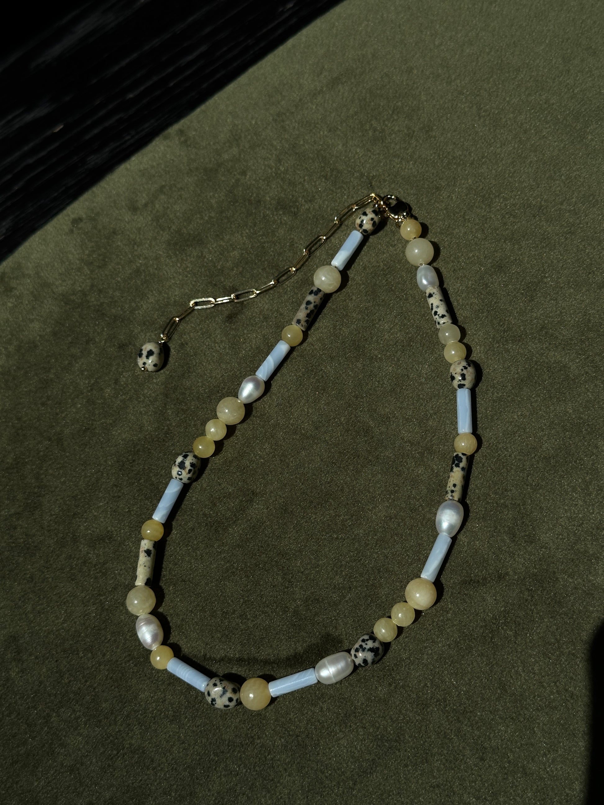- Materials: natural dalmatian jasper, natural freshwater pearl, natural agate, natural yellow jade, 14k gold plated findings.