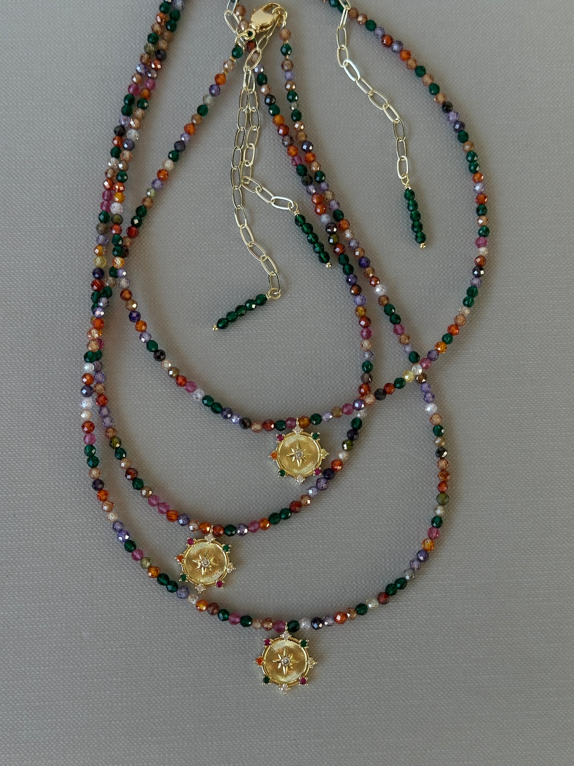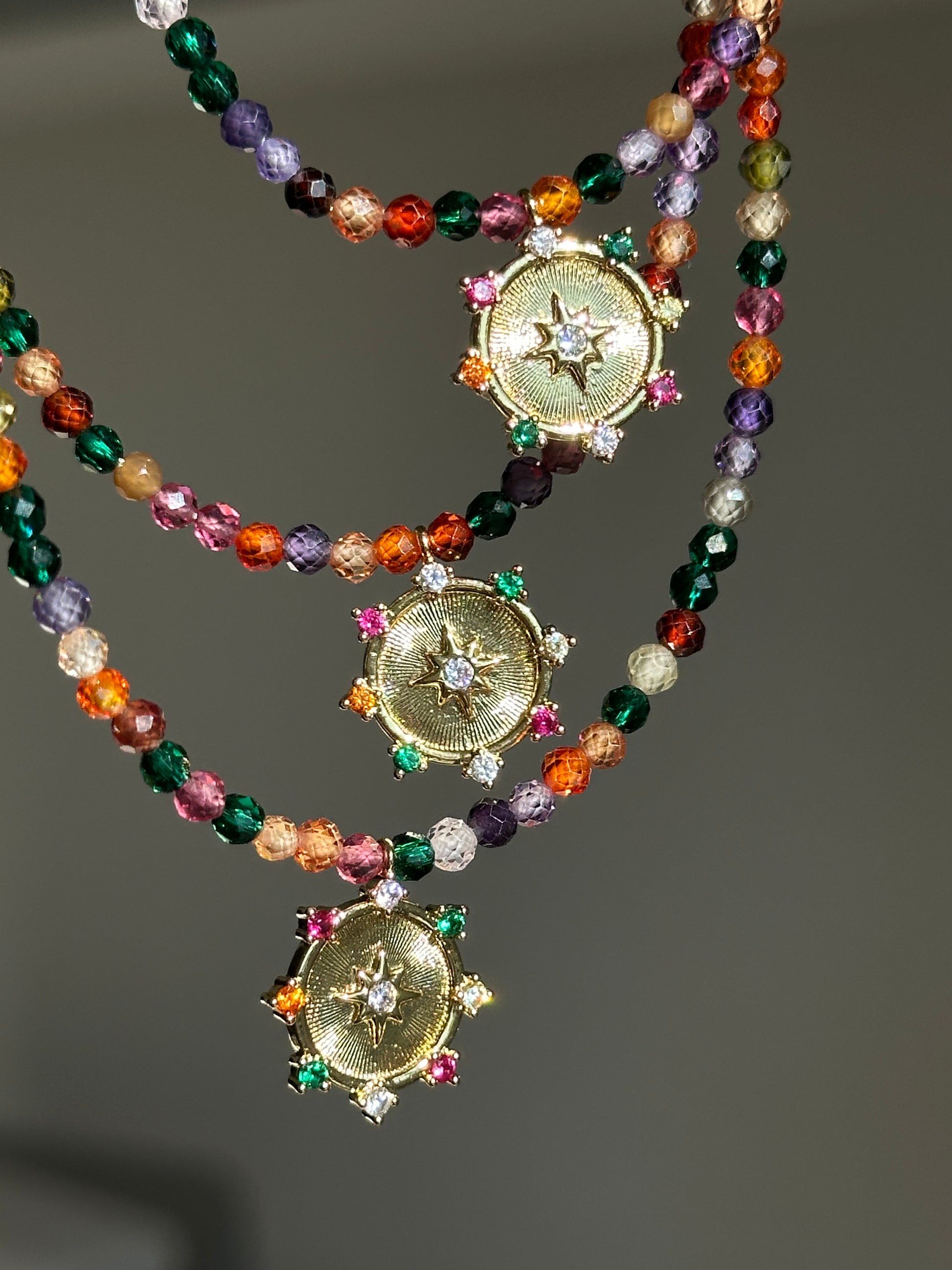 POLARIS necklace features multi coloured faceted cubic zirconia beads with polaris star charm as a center piece. Polaris star is a powerful symbol of unwavering hope and resilience, a reminder to stay true to outselves and follow our own path.