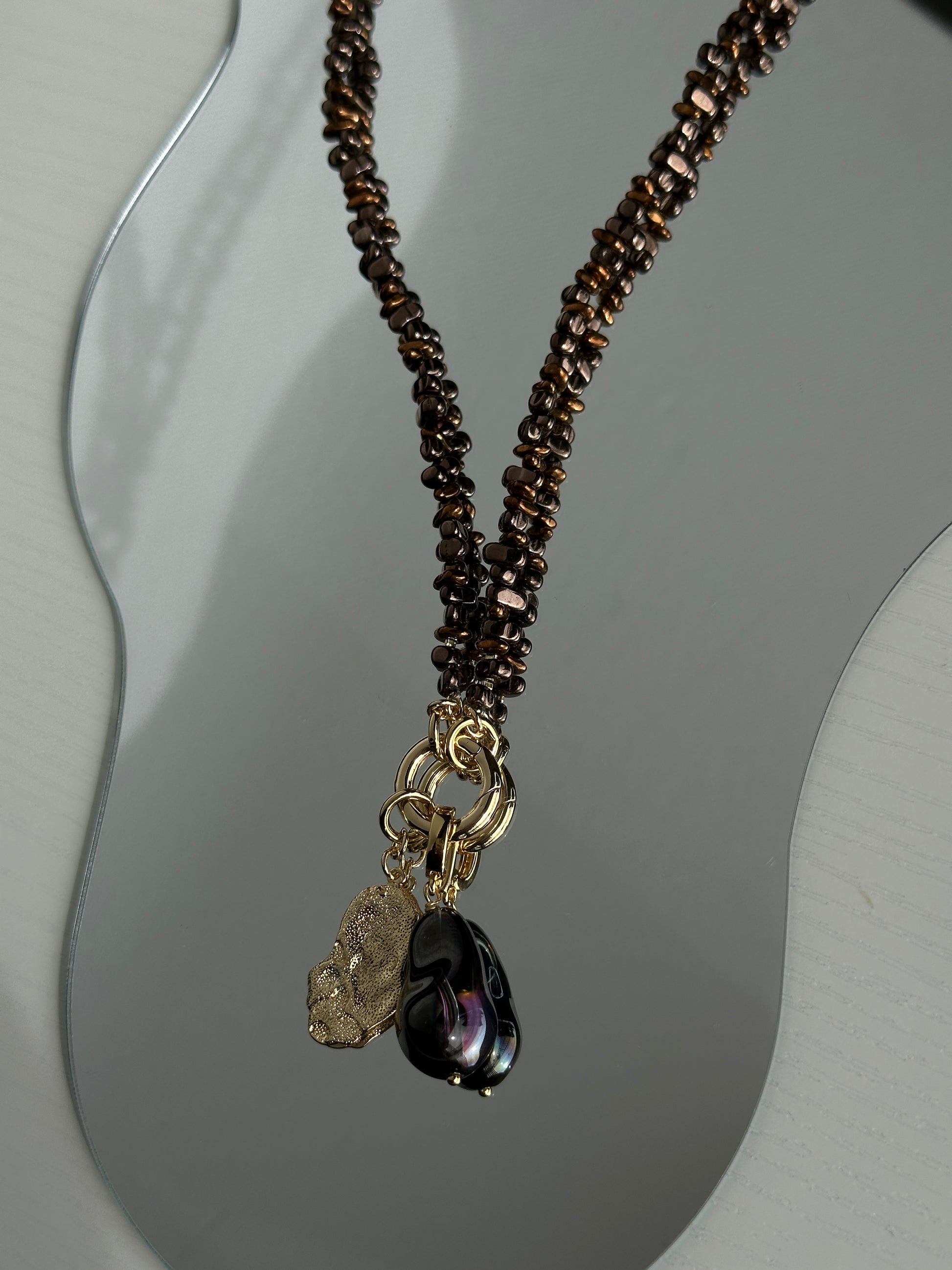DORIS necklace features a strand of natural hematite stone beads with the link clasp and 2 detachable pendants: irregular shape hammered pendant and baroque pearl shaped glass pendant on enhancer bail. An enhancer is a type of bail that hinges open in the back. This means you can open it up and clip your pendant right onto the middle of your beaded necklace or you can transform your necklace into a Y-shaped one by following these simple steps:
